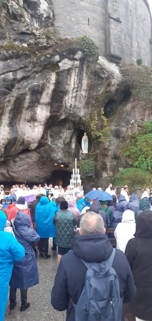Il cuore di tutto fu la Messa internazionale nella basilica S. Pio X: in quell’anfiteatro colmo incredibilmente, nella processione dei celebranti verso l’altare, in quelle letture proclamate in lingue diverse, insieme abbiamo vissuto totalmente la realtà della Chiesa in tutte le sue componenti. Il passaggio alla grotta ci ha emozionati e qualche lacrima è scesa anche dagli occhi e non soltanto dal cielo; con noi erano presenti tutti coloro che erano rimasti a casa, ma che ci avevano chiesto un ricordo.