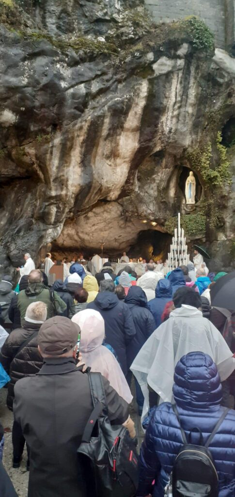 Il cuore di tutto fu la Messa internazionale nella basilica S. Pio X: in quell’anfiteatro colmo incredibilmente, nella processione dei celebranti verso l’altare, in quelle letture proclamate in lingue diverse, insieme abbiamo vissuto totalmente la realtà della Chiesa in tutte le sue componenti. Il passaggio alla grotta ci ha emozionati e qualche lacrima è scesa anche dagli occhi e non soltanto dal cielo; con noi erano presenti tutti coloro che erano rimasti a casa, ma che ci avevano chiesto un ricordo.